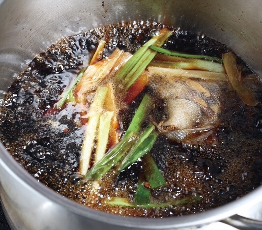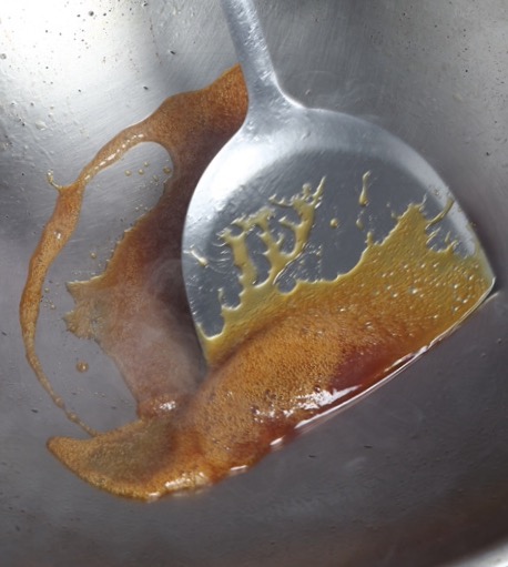 利用炒鍋餘油炒二砂糖, 炒至溶化加水煮開,
